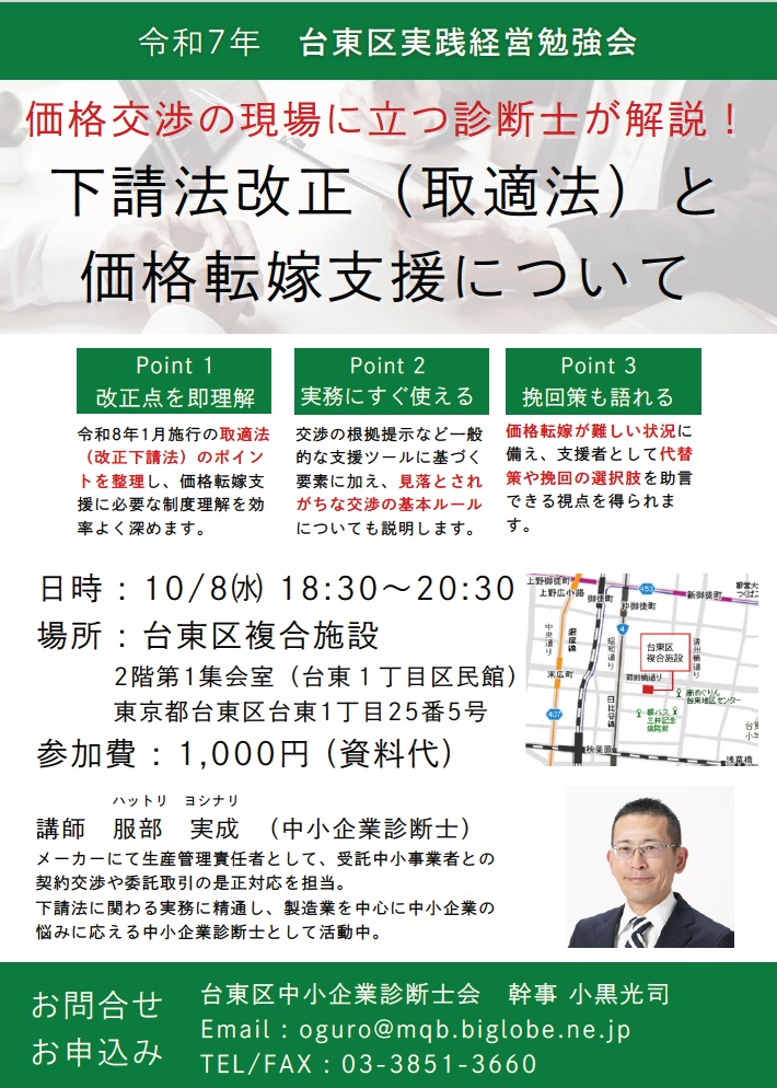 今回は講師に 服部 実成 先生を講師に迎え「改正下請法のポイントと価格転嫁!」と題しお話しいただきます。