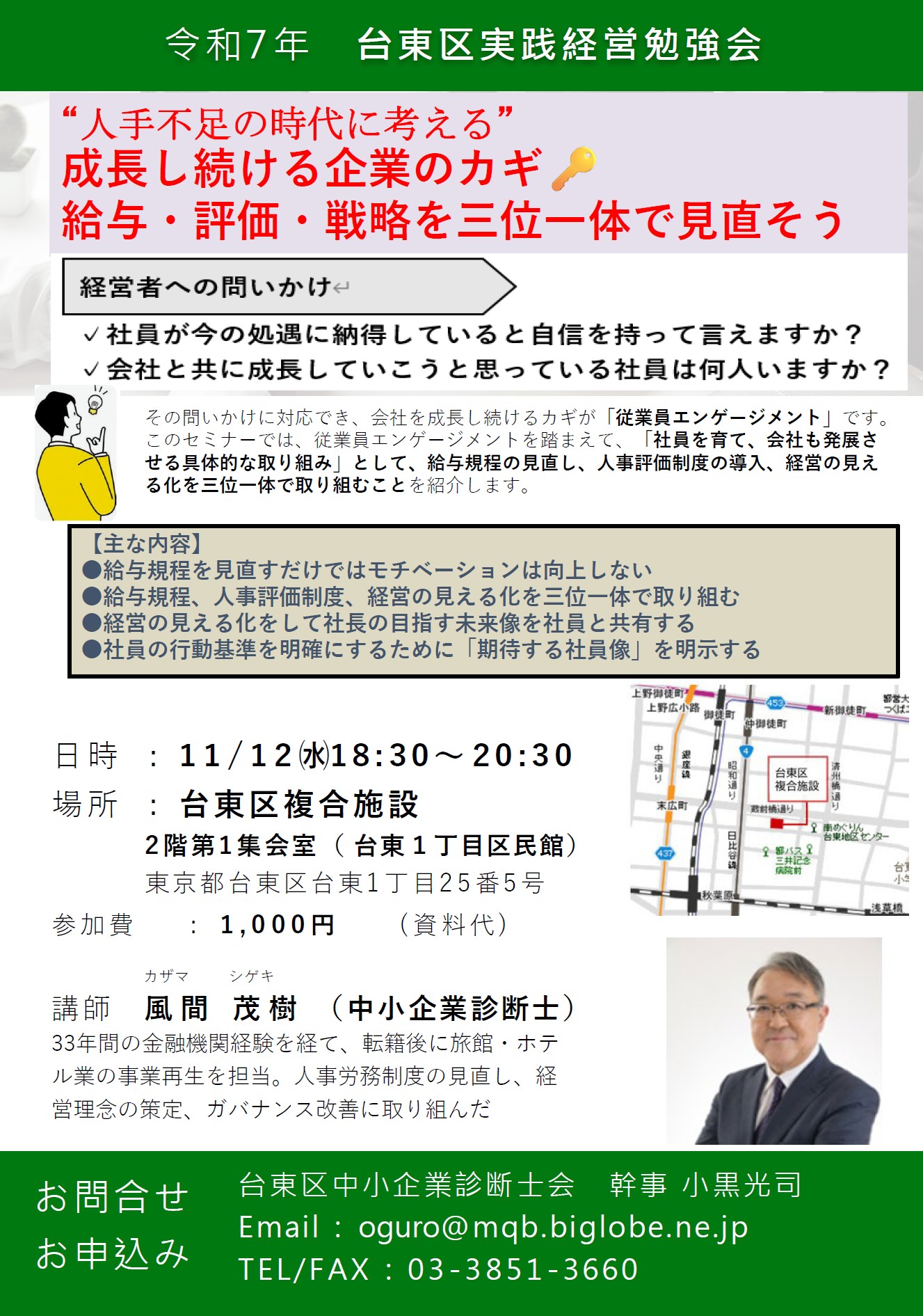 今回は講師に風間 茂樹 先生を講師に迎え「成長し続ける企業のカギ、給与、評価、戦略の三位一体の見直し」