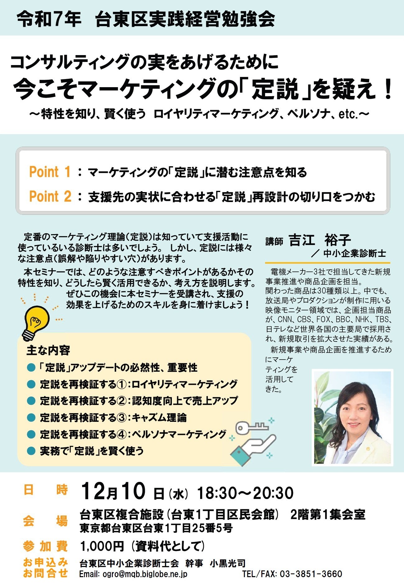今回は講師に吉江 裕子先生を迎え「今こそマーケティングの定説を疑え!」