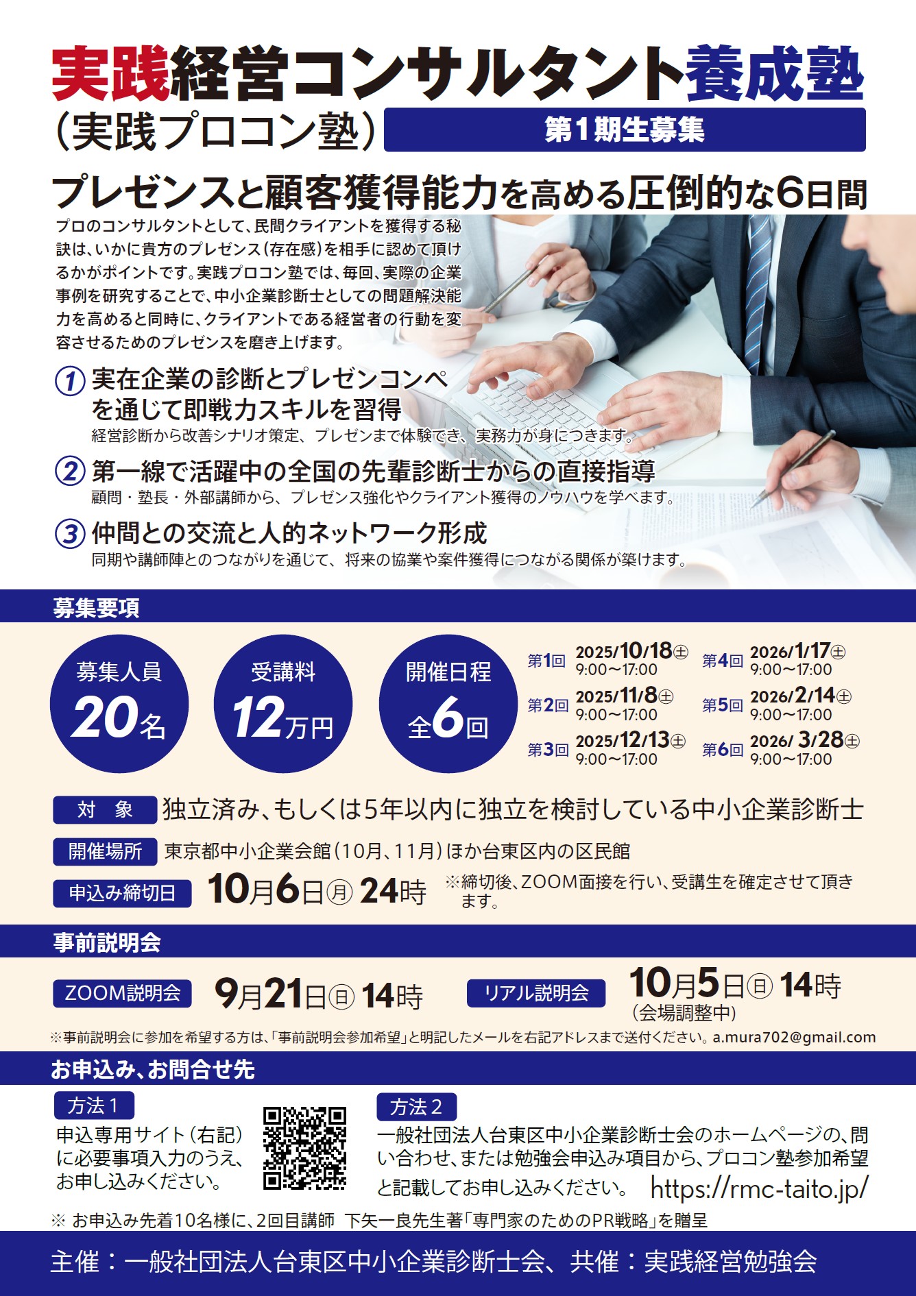 一般社団法人台東区中小企業診断士会では、独立を志す診断士や実務の幅を広げたい診断士を対象に、「実践経営コンサルタント養成塾(実践プロコン塾)」を開講します。本塾は、“プレゼンス(存在感)”を高め、民間クライアントから信頼される診断士へと成長するための実践型プログラムです。単なる知識の習得にとどまらず、実在企業を題材に、経営診断・改善提案・プレゼンテーションを一貫して体験することで、真の“実務力”を養います。