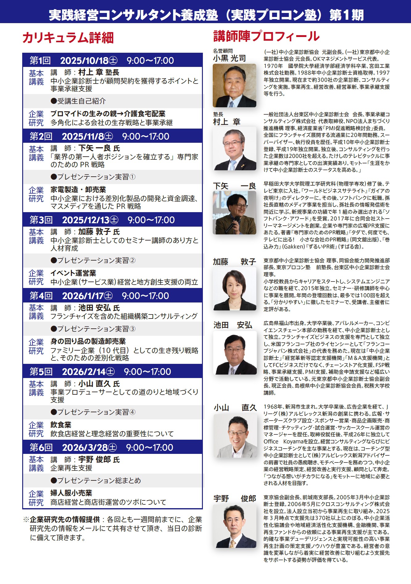 第1期(全6回)は2025年10月より開講されました。「顧問契約獲得のポイント」「専門家のPR戦略」「セミナー講師としての伝え方」「フランチャイズ・組織構築」「地域づくり支援」「企業再生支援」など、幅広いテーマを実践的に学びます。各回では、実在企業を研究対象とし、事前に企業情報を共有。講義当日は、経営診断から改善シナリオの策定、最終プレゼンテーションまでを体験します。これにより、理論と現場感覚を融合させた“即戦力スキル”が身につきます。